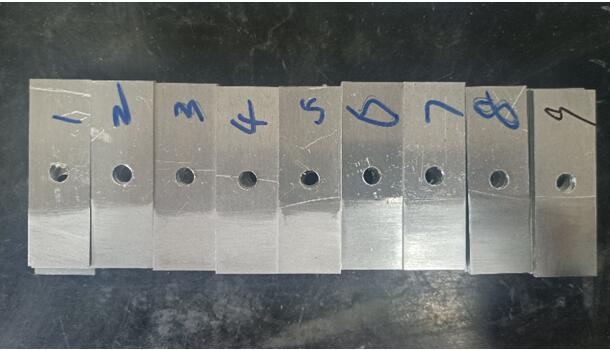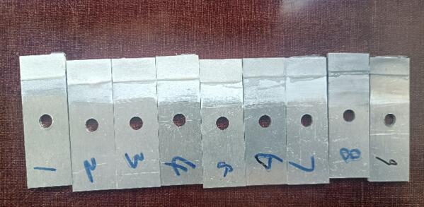我們選取的砂布目數(shù)為:60、120、180、320、600、800、1200、1500、2000。我們分別按1-9給這個(gè)試片進(jìn)行排序。1代表60目,2代表120目...,我們能從打磨痕跡看出,號(hào)數(shù)越大的,打磨越細(xì)膩,1500和2000目砂紙打磨的硬鋁試片基本能呈現(xiàn)出鏡面光澤。(下面的圖片拍攝可能是反光問(wèn)題,不能看出差異,實(shí)物實(shí)際是很能看出來(lái)區(qū)別的,不信你試試,哈哈)