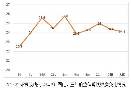 XY304的3年內(nèi)剪切強(qiáng)度變化平緩,且3年的數(shù)據(jù)相比較早的基礎(chǔ)數(shù)據(jù)還有所提高,強(qiáng)度并未降低。XY301和XY302的剪切變化有起伏,但是波動(dòng)不大均在15%的范圍,且均相比基點(diǎn)數(shù)據(jù)要高,也說(shuō)明室溫下的環(huán)氧膠完全固化達(dá)到最終強(qiáng)度的時(shí)間較長(zhǎng),膠接強(qiáng)度前期會(huì)隨著時(shí)間的增長(zhǎng)而有所增長(zhǎng)。