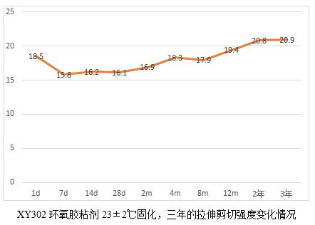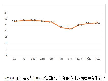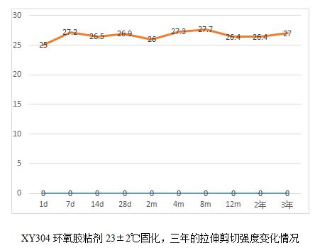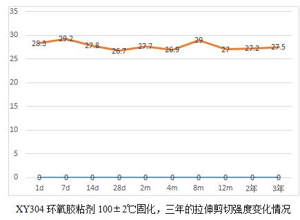 當(dāng)然通過(guò)這6個(gè)表,我們也能看出規(guī)律就是,膠粘劑產(chǎn)品高溫固化相對(duì)較為完全,后續(xù)老化數(shù)據(jù)影響不大,而常溫固化數(shù)據(jù)明顯低于高溫固化,比如XY304,常溫固化數(shù)據(jù)未25兆帕,高溫固化為28.3兆帕,而XY301室溫固化數(shù)據(jù)22.5兆帕,高溫固化為28.2,相比高出25%。