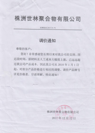 您現(xiàn)在的位置:世林膠業(yè)首頁 - 資訊大全 - 世林膠業(yè)2018年1月調(diào)價(jià)通知